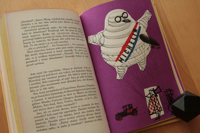 ソ連の作家イリヤ・エレンブルグの風刺小説のチェコ語訳版に チェコのイラストレーター、ヤロスラフ・フィセルが挿絵を手掛けた一冊。 赤、紫、緑の3色が映えるポップなイラスト7点を収録。 デザインはズデニェク・セイドゥルが担当。テキストはチェコ語。