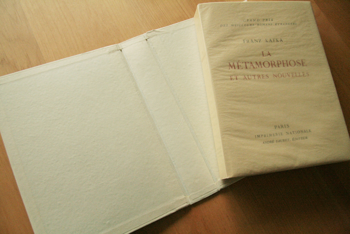 有名アーティストのレゾネ、挿画本などを数多く手掛けている モナコの出版社アンドレ・ソーレから出版されたフランツ・カフカの 作品集。タイトルの「変身」のほか、「流刑地にて」、「判決」など 計12作品を収録。 1955年、外国人作家の名作選集 (18冊)の一冊で、限定3000部のうちの 特装版300部 (エディション No. CLX )の一冊。 巻頭に挟み綴じられたカフカの肖像画 (エッチング)の他、 別刷 (唐紙)にて一葉が収録されています。 イラストを手掛けたのは、フランスの画家で作曲家のミシェル・シリー。 陰鬱としたカフカの表情が細い線で表されています。 スリップケース+フォルダー (厚紙製で背はベラム)付き。 テキストはフランス語、フランス装丁。 |
