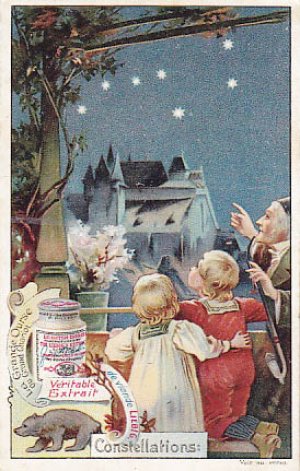 【LIEBIG】リービッヒ1867年創業、ロンドンを拠点とした食品メーカー (濃縮ブイヨンスープ)【リービッヒ】のクロモカードです。ボン・マルシェ同様、コレクターが多い人気のカードで、瓶のマークが描かれているのが特徴です。『星座』シリーズの1枚で、大熊座が描かれています。テキストはフランス語。size : 7cm x 11cmcondition : 経年ヤケ・汚れ・スレ