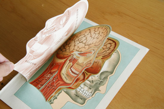 仕掛け絵本のように立体にはなりませんが、頭部、脳、臓器のイラストが