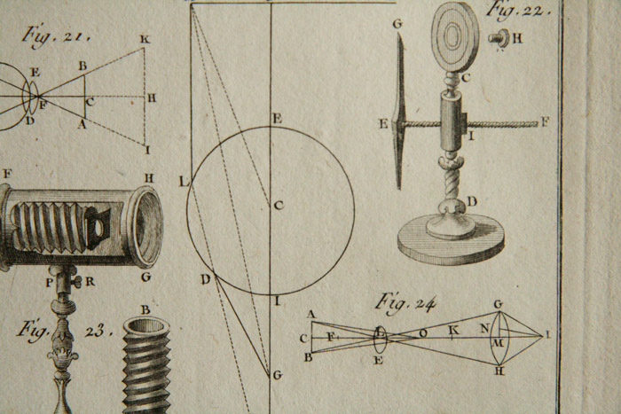 1782年から1832年の50年もの歳月をかけて、200巻を超える大著で出版されたフランスの【体系百科全集】。本品は、『Optique』の タイトルがついた一葉で、カメラ・オブスキュラの原理図などが 銅版画で描かれています。 手漉きの紙で、端(三方)は裁断されていないままの状態です。(詳細画像1,2参照) size : 22cm x 31.5cm condition : ヤケ・シミ