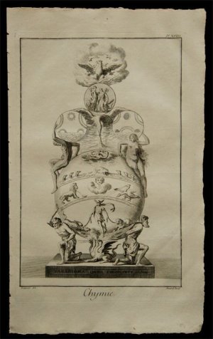 1751年から1772年までの20年間に全28巻が出版されたフランスの【百科全書】。本品は『Chymie』の タイトルがついた銅版画三葉で、天体を支えるアトラスやグリフォンなどが描かれた寓意図が一葉、塩の結晶図が二葉。 手漉きの紙で、端 (三方) は裁断されていないままです。size : 26cm x 43cm condition : 経年ヤケ・シミ・折れ跡