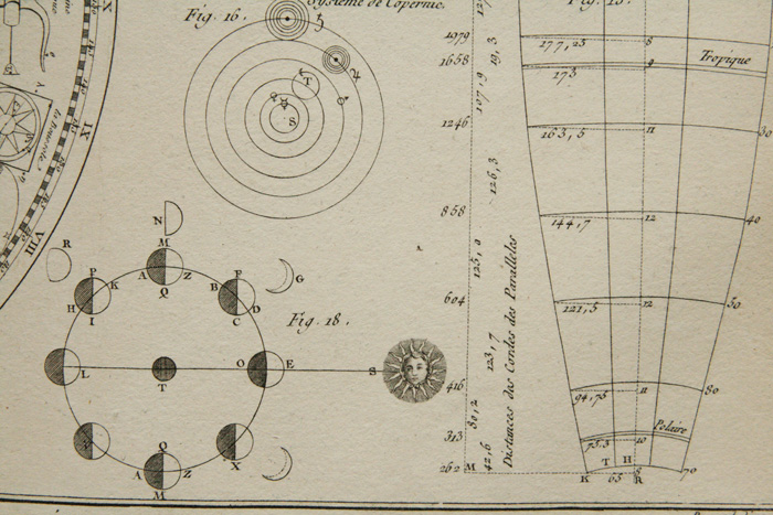 1782年から1832年の50年もの歳月をかけて、200巻を超える大著で出版されたフランスの【体系百科全集】。 本品は、『Astronomie』の タイトルがついた一葉で、星図、天空儀などが銅版画で描かれています。 手漉きの紙で、端 (四方)は裁断されていないままの状態。 裏面には紙片(製本用)が付いています。(詳細画像参照)size : 31.5cm x 46.5cm condition : ヤケ・シミ・折れ跡・シワ・欠け